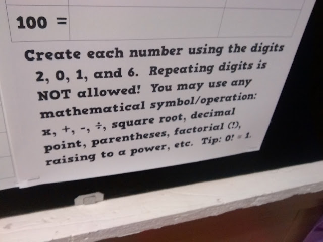 The 2016 Challenge. Because, it's...you know...2016. The goal is for students to create the numbers 1-100 using only the digits 2, 0, 1, and 6. Students may add/subtract/multiply/divide, use parentheses, exponents, factorials, square roots, or whatever their little heart desires.